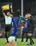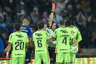 Ciudad de México, 21 de abril de 2026. Oscar Mejía muestra tarjeta roja de expulsión a Eder Lopez, durante el partido correspondiente a la jornada 16 del torneo Clausura 2026 de la Liga BBVA MX, entre los Pumas de la UNAM y los Bravos de FC Juárez, realizado en el estadio Olímpico Universitario. Foto: Imago7/ Etzel Espinosa