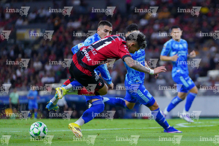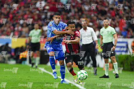 Guadalajara, Jalisco, 22 de abril de 2026. Eduardo Aguirre y Cesar Araújo, durante el partido correspondiente a la jornada 16 del torneo Clausura 2026 de la Liga BBVA MX, entre los Rojinegros del Atlas y los Tigres de la UANL, realizado en el estadio Jalisco. Foto: Imago7/ Juan Carlos Cubeyro.