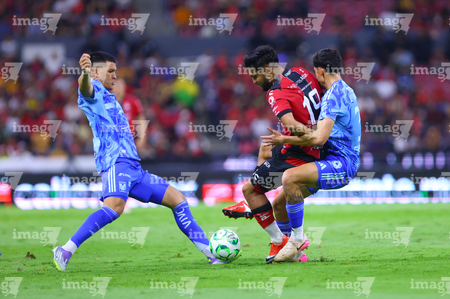 Guadalajara, Jalisco, 22 de abril de 2026. Rodrigo Schlegel, Ángel Correa y Aldo Rocha durante el partido correspondiente a la jornada 16 del torneo Clausura 2026 de la Liga BBVA MX, entre los Rojinegros del Atlas y los Tigres de la UANL, realizado en el estadio Jalisco. Foto: Imago7/ Juan Carlos Cubeyro.