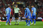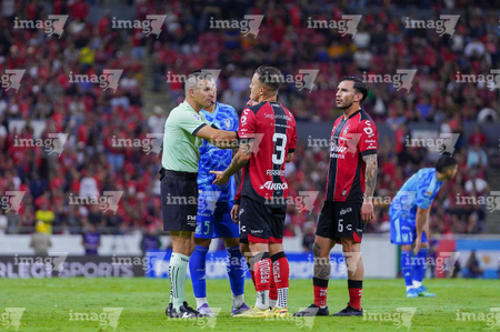Guadalajara, Jalisco, 22 de abril de 2026. Rodrigo Schlegel y Fernando Hernández, árbitro central, durante el partido correspondiente a la jornada 16 del torneo Clausura 2026 de la Liga BBVA MX, entre los Rojinegros del Atlas y los Tigres de la UANL, realizado en el estadio Jalisco. Foto: Imago7/ Juan Carlos Cubeyro.