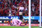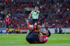 Guadalajara, Jalisco, 22 de abril de 2026. Diego Lainez resultó lesionado, durante el partido correspondiente a la jornada 16 del torneo Clausura 2026 de la Liga BBVA MX, entre los Rojinegros del Atlas y los Tigres de la UANL, realizado en el estadio Jalisco. Foto: Imago7/ Juan Carlos Cubeyro.