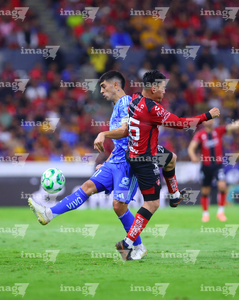 Guadalajara, Jalisco, 22 de abril de 2026. Diego González y Jesús Angulo, durante el partido correspondiente a la jornada 16 del torneo Clausura 2026 de la Liga BBVA MX, entre los Rojinegros del Atlas y los Tigres de la UANL, realizado en el estadio Jalisco. Foto: Imago7/ Juan Carlos Cubeyro.