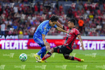 Guadalajara, Jalisco, 22 de abril de 2026. Rodrigo Schlegel y Camilo Vargas, durante el partido correspondiente a la jornada 16 del torneo Clausura 2026 de la Liga BBVA MX, entre los Rojinegros del Atlas y los Tigres de la UANL, realizado en el estadio Jalisco. Foto: Imago7/ Juan Carlos Cubeyro.