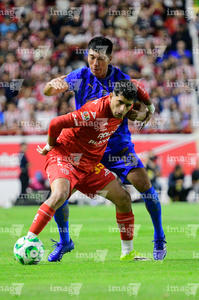 Aguascalientes, Aguascalientes, 22 de abril de 2026. Yael Padilla y Miguel Tapias, durante el partido correspondiente a la jornada 16 del torneo Clausura 2026 de la Liga BBVA MX, entre los Rayos del Necaxa y las Chivas Rayadas del Guadalajara, realizado en el estadio Victoria. Foto: Imago7/ Pablo Ramírez