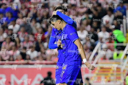 Aguascalientes, Aguascalientes, 22 de abril de 2026. Brian Gutiérrez y Kevin Gutiérrez, durante el partido correspondiente a la jornada 16 del torneo Clausura 2026 de la Liga BBVA MX, entre los Rayos del Necaxa y las Chivas Rayadas del Guadalajara, realizado en el estadio Victoria. Foto: Imago7/ Pablo Ramírez