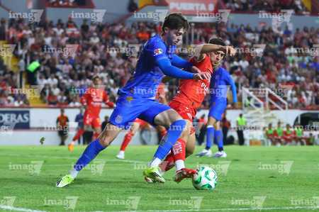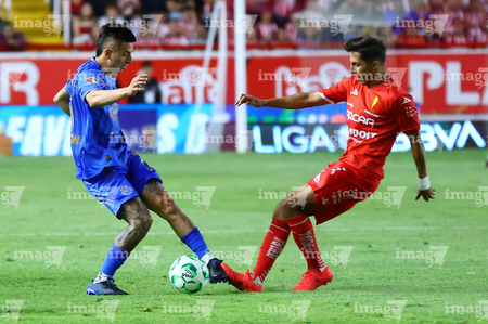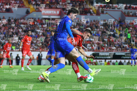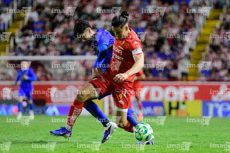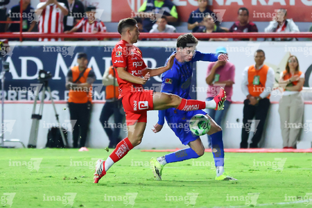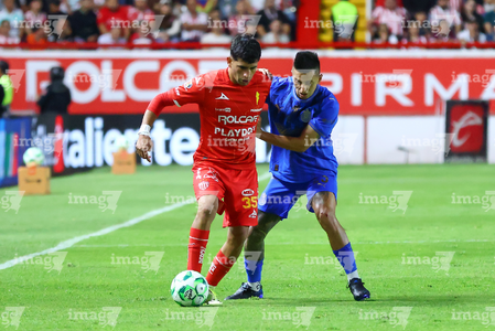 Aguascalientes, Aguascalientes, 22 de abril de 2026. Javier Ruiz y Daniel Aguirre, durante el partido correspondiente a la jornada 16 del torneo Clausura 2026 de la Liga BBVA MX, entre los Rayos del Necaxa y las Chivas Rayadas del Guadalajara, realizado en el estadio Victoria. Foto: Imago7/ Pablo Ramírez