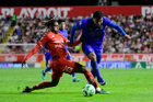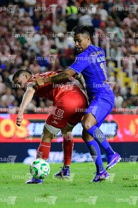Aguascalientes, Aguascalientes, 22 de abril de 2026. Alexis Peña y Efraín Álvarez, durante el partido correspondiente a la jornada 16 del torneo Clausura 2026 de la Liga BBVA MX, entre los Rayos del Necaxa y las Chivas Rayadas del Guadalajara, realizado en el estadio Victoria. Foto: Imago7/ Pablo Ramírez