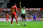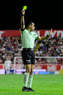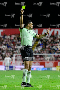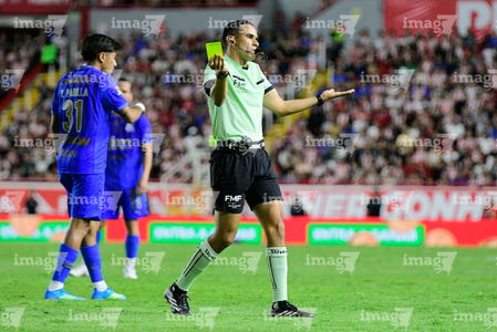 Aguascalientes, Aguascalientes, 22 de abril de 2026. Joaquin Alberto Vizcarra, árbitro central muestra tarjeta amarilla de amonestación, durante el partido correspondiente a la jornada 16 del torneo Clausura 2026 de la Liga BBVA MX, entre los Rayos del Necaxa y las Chivas Rayadas del Guadalajara, realizado en el estadio Victoria. Foto: Imago7/ Pablo Ramírez