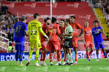 Aguascalientes, Aguascalientes, 22 de abril de 2026. Jugadores de Necaxa en reclamo a Joaquin Alberto Vizcarra, árbitro central, durante el partido correspondiente a la jornada 16 del torneo Clausura 2026 de la Liga BBVA MX, entre los Rayos del Necaxa y las Chivas Rayadas del Guadalajara, realizado en el estadio Victoria. Foto: Imago7/ Pablo Ramírez