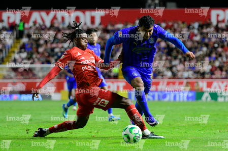 Aguascalientes, Aguascalientes, 22 de abril de 2026. Bryan González y Kevin Ante, durante el partido correspondiente a la jornada 16 del torneo Clausura 2026 de la Liga BBVA MX, entre los Rayos del Necaxa y las Chivas Rayadas del Guadalajara, realizado en el estadio Victoria. Foto: Imago7/ Pablo Ramírez
