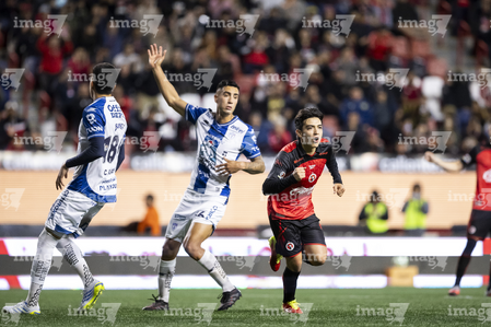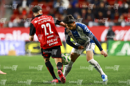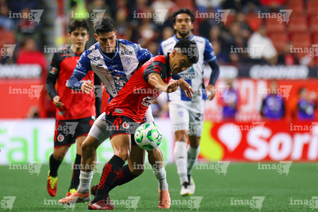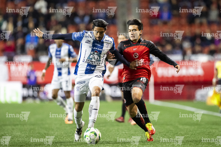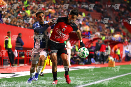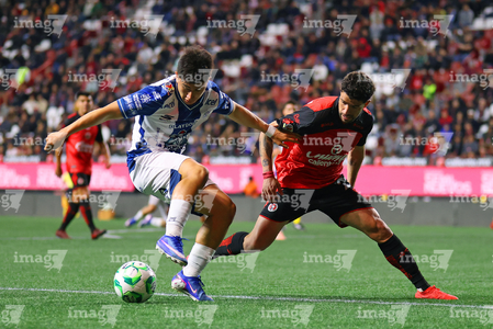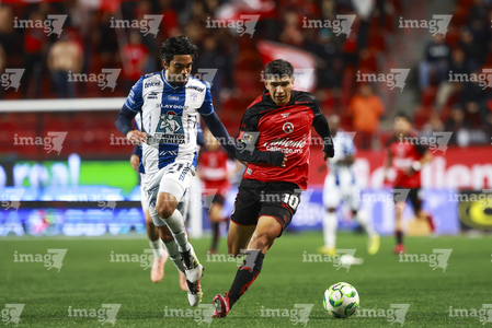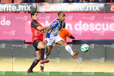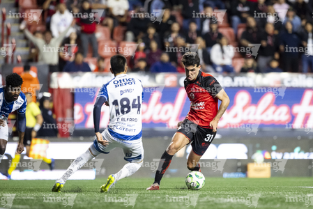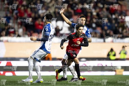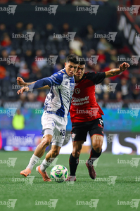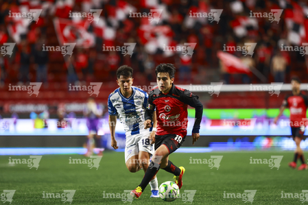 Tijuana, Baja California, 22 de abril de 2026. Alán Bautista y Jesús Alejandro Gómez, durante el partido correspondiente a la jornada 16 del torneo Clausura 2026 de la Liga BBVA MX, entre los Xolos de Tijuana y los Tuzos del Pachuca, realizado en el estadio Caliente. Foto: Imago7/ David Vega