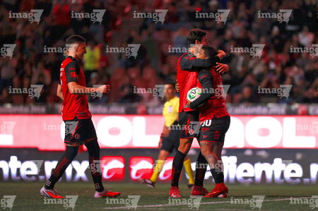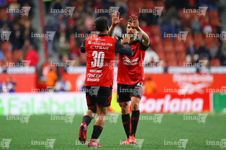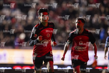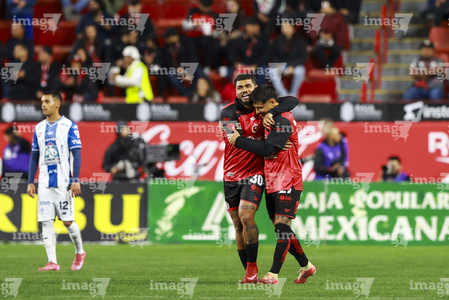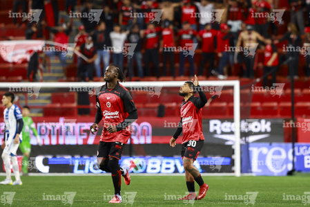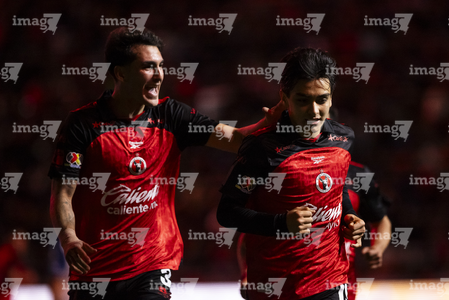 Tijuana, Baja California, 22 de abril de 2026. Gilberto Mora y Diego Abreu en festejo de gol, durante el partido correspondiente a la jornada 16 del torneo Clausura 2026 de la Liga BBVA MX, entre los Xolos de Tijuana y los Tuzos del Pachuca, realizado en el estadio Caliente. Foto: Imago7/Alejandro Gutiérrez Mora