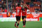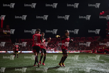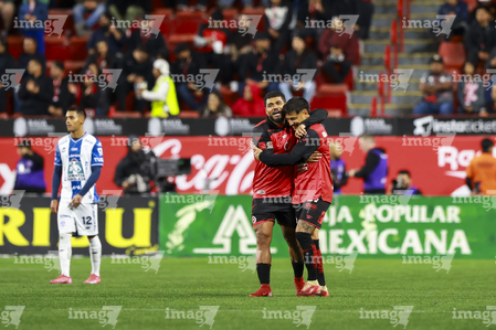 Tijuana, Baja California, 22 de abril de 2026. Josef Martínez y José Ignacio Rivero en festejo de gol durante el partido correspondiente a la jornada 16 del torneo Clausura 2026 de la Liga BBVA MX, entre los Xolos de Tijuana y los Tuzos del Pachuca, realizado en el estadio Caliente. Foto: Imago7/ David Vega