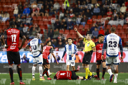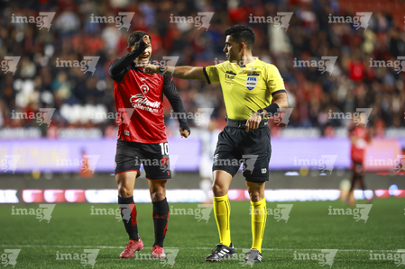 Tijuana, Baja California, 22 de abril de 2026. Kevin Castañeda en reclamo a Adonai Escobedo, árbitro central, durante el partido correspondiente a la jornada 16 del torneo Clausura 2026 de la Liga BBVA MX, entre los Xolos de Tijuana y los Tuzos del Pachuca, realizado en el estadio Caliente. Foto: Imago7/ David Vega