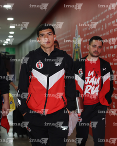 y Miguel Tapias , durante el partido correspondiente a la jornada 17 del torneo Clausura 2026 de la Liga BBVA MX, entre las Chivas Rayadas del Guadalajara y los Xolos de Tijuana, realizado en el estadio Akron. Foto: Imago7/Cristian Hernandez