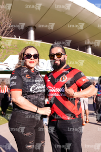 Katia Itzel García Mendoza y Omar Govea , durante el partido correspondiente a la jornada 17 del torneo Clausura 2026 de la Liga BBVA MX, entre las Chivas Rayadas del Guadalajara y los Xolos de Tijuana, realizado en el estadio Akron. Foto: Imago7/Cristian Hernandez