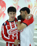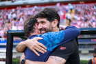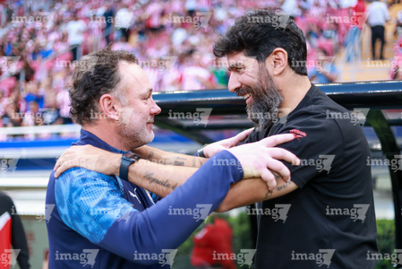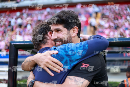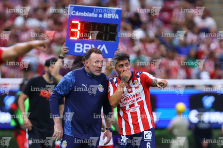 Zapopan, Jalisco, 25 de abril de 2026. Gabriel Milito, director técnico y Omar Govea, durante el partido correspondiente a la jornada 17 del torneo Clausura 2026 de la Liga BBVA MX, entre las Chivas Rayadas del Guadalajara y los Xolos de Tijuana, realizado en el estadio Akron. Foto: Imago7/ Juan Carlos Cuebeyro