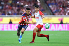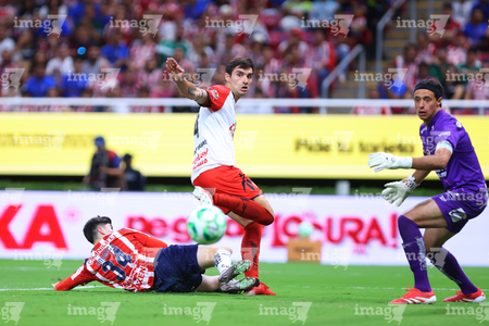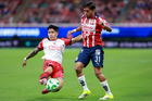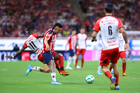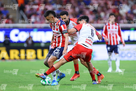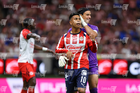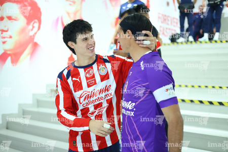 Zapopan, Jalisco, 25 de abril de 2026. Roberto Alvarado "Piojo" y Jesús Gómez, durante el partido correspondiente a la jornada 17 del torneo Clausura 2026 de la Liga BBVA MX, entre las Chivas Rayadas del Guadalajara y los Xolos de Tijuana, realizado en el estadio Akron. Foto: Imago7/ Juan Carlos Cuebeyro