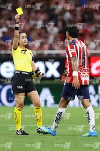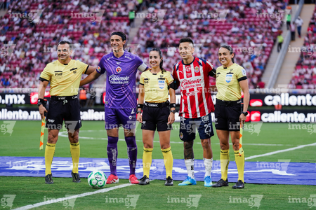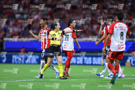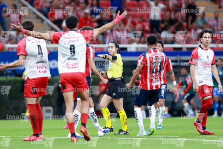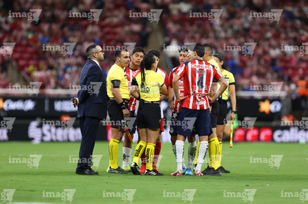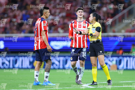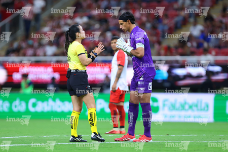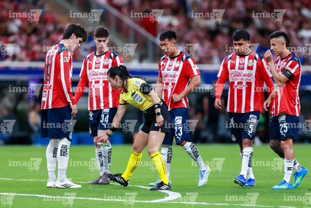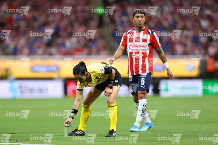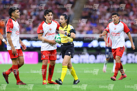 Zapopan, Jalisco, 25 de abril de 2026. Katia Itzel García, árbitro central y José Antonio Rodríguez, durante el partido correspondiente a la jornada 17 del torneo Clausura 2026 de la Liga BBVA MX, entre las Chivas Rayadas del Guadalajara y los Xolos de Tijuana, realizado en el estadio Akron. Foto: Imago7/ Juan Carlos Cuebeyro