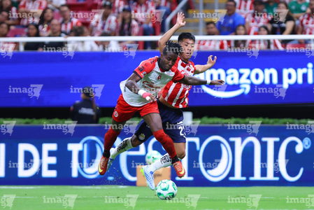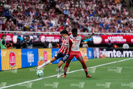 Zapopan, Jalisco, 25 de abril de 2026. Adonis Preciado y Daniel Aguirre, durante el partido correspondiente a la jornada 17 del torneo Clausura 2026 de la Liga BBVA MX, entre las Chivas Rayadas del Guadalajara y los Xolos de Tijuana, realizado en el estadio Akron. Foto: Imago7/ Juan Carlos Cuebeyro