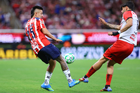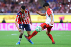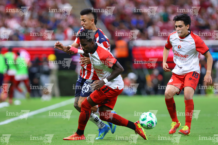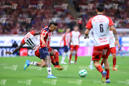 Zapopan, Jalisco, 25 de abril de 2026. Roberto Alvarado "Piojo" y Adonis Preciado, durante el partido correspondiente a la jornada 17 del torneo Clausura 2026 de la Liga BBVA MX, entre las Chivas Rayadas del Guadalajara y los Xolos de Tijuana, realizado en el estadio Akron. Foto: Imago7/ Juan Carlos Cuebeyro