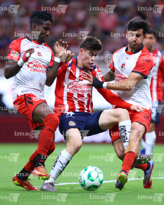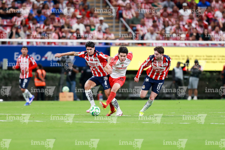 Zapopan, Jalisco, 25 de abril de 2026. Adonis Preciado, Armando González y Jesús Gómez, durante el partido correspondiente a la jornada 17 del torneo Clausura 2026 de la Liga BBVA MX, entre las Chivas Rayadas del Guadalajara y los Xolos de Tijuana, realizado en el estadio Akron. Foto: Imago7/ Juan Carlos Cuebeyro