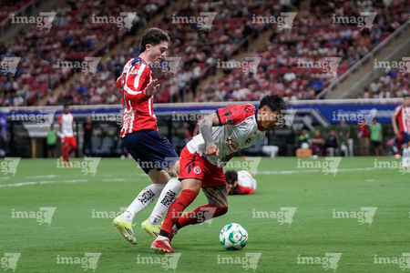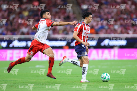 Zapopan, Jalisco, 25 de abril de 2026. Ricardo Marín y Adonis Preciado, durante el partido correspondiente a la jornada 17 del torneo Clausura 2026 de la Liga BBVA MX, entre las Chivas Rayadas del Guadalajara y los Xolos de Tijuana, realizado en el estadio Akron. Foto: Imago7/ Juan Carlos Cuebeyro