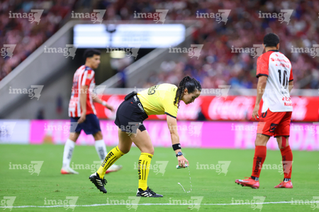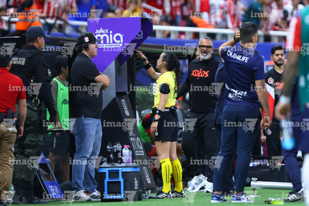 Zapopan, Jalisco, 25 de abril de 2026. Katia Itzel García, árbitro central consulta el VAR, durante el partido correspondiente a la jornada 17 del torneo Clausura 2026 de la Liga BBVA MX, entre las Chivas Rayadas del Guadalajara y los Xolos de Tijuana, realizado en el estadio Akron. Foto: Imago7/ Juan Carlos Cuebeyro