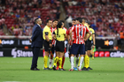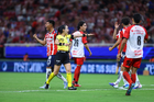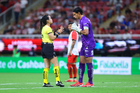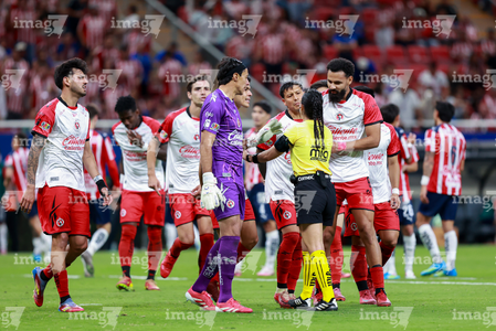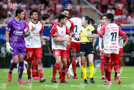 Zapopan, Jalisco, 25 de abril de 2026. Roberto Alvarado "Piojo" en reclamo a Katia Itzel García, árbitro central, durante el partido correspondiente a la jornada 17 del torneo Clausura 2026 de la Liga BBVA MX, entre las Chivas Rayadas del Guadalajara y los Xolos de Tijuana, realizado en el estadio Akron. Foto: Imago7/ Juan Carlos Cuebeyro