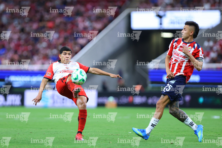Zapopan, Jalisco, 25 de abril de 2026. Iván Tona y Richard Ledezma, durante el partido correspondiente a la jornada 17 del torneo Clausura 2026 de la Liga BBVA MX, entre las Chivas Rayadas del Guadalajara y los Xolos de Tijuana, realizado en el estadio Akron. Foto: Imago7/ Juan Carlos Cuebeyro