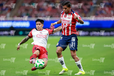 Zapopan, Jalisco, 25 de abril de 2026. Kevin Castañeda y Daniel Aguirre, durante el partido correspondiente a la jornada 17 del torneo Clausura 2026 de la Liga BBVA MX, entre las Chivas Rayadas del Guadalajara y los Xolos de Tijuana, realizado en el estadio Akron. Foto: Imago7/ Juan Carlos Cuebeyro