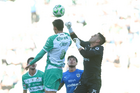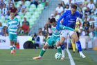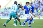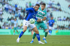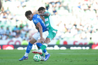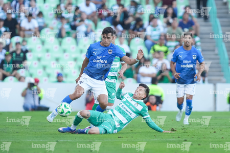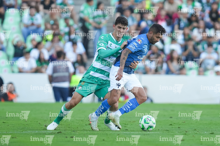 Torreón, Coahuila, 26 de abril de 2026. Kevin Picon y Lucas Ocampos, durante el partido correspondiente a la jornada 17 del torneo Clausura 2026 de la Liga BBVA MX, entre los Guerreros de Santos Laguna y los Rayados del Monterrey, realizado en el estadio Corona. Foto: Imago7/ Saul Perales