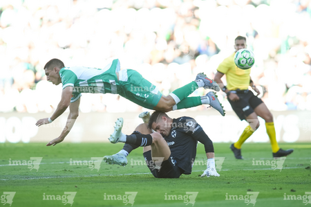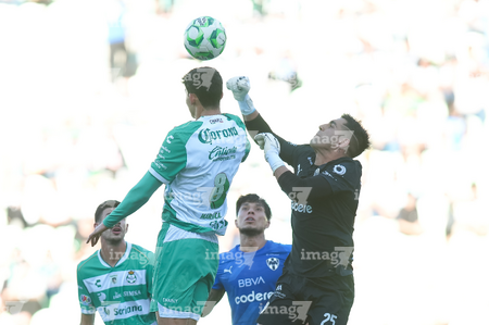 Torreón, Coahuila, 26 de abril de 2026. Salvador Mariscal y Jesús Manuel Corona "Tecatito", durante el partido correspondiente a la jornada 17 del torneo Clausura 2026 de la Liga BBVA MX, entre los Guerreros de Santos Laguna y los Rayados del Monterrey, realizado en el estadio Corona. Foto: Imago7/ Erick Saavedra