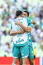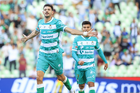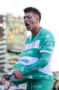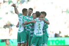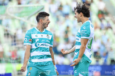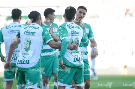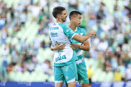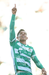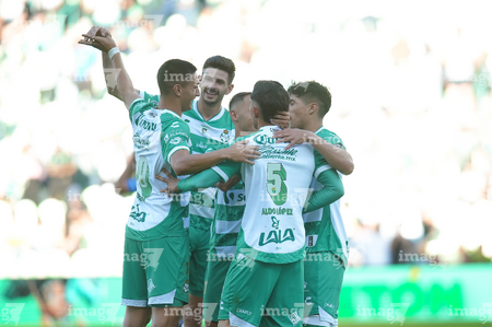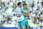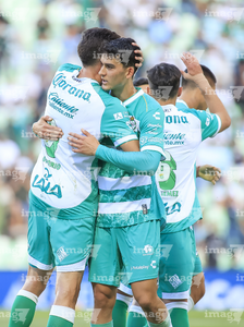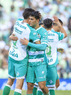 Torreón, Coahuila, 26 de abril de 2026. Jugadores del Santos Laguna en festejo de gol, durante el partido correspondiente a la jornada 17 del torneo Clausura 2026 de la Liga BBVA MX, entre los Guerreros de Santos Laguna y los Rayados del Monterrey, realizado en el estadio Corona. Foto: Imago7/ Erick Saavedra