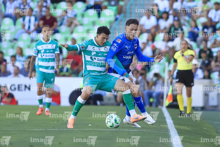 Torreón, Coahuila, 26 de abril de 2026. Lucas Ocampos y Emmanuel Echeverría, durante el partido correspondiente a la jornada 17 del torneo Clausura 2026 de la Liga BBVA MX, entre los Guerreros de Santos Laguna y los Rayados del Monterrey, realizado en el estadio Corona. Foto: Imago7/ Erick Saavedra