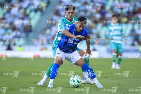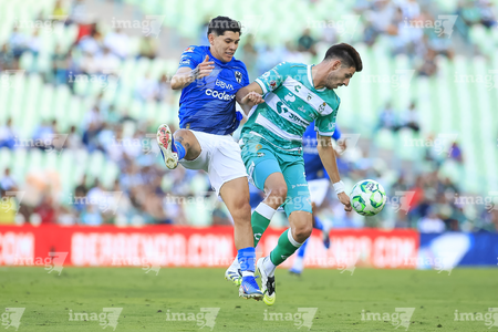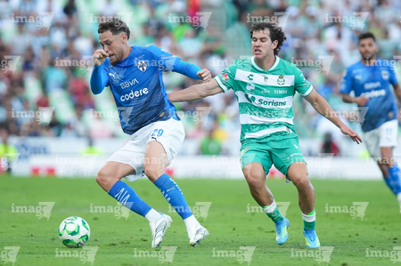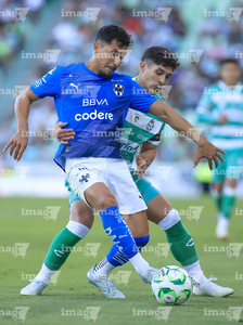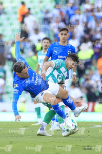 Torreón, Coahuila, 26 de abril de 2026. Joaquín Moxica y Bruno Amione, durante el partido correspondiente a la jornada 17 del torneo Clausura 2026 de la Liga BBVA MX, entre los Guerreros de Santos Laguna y los Rayados del Monterrey, realizado en el estadio Corona. Foto: Imago7/ Erick Saavedra
