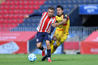 Tepatitlán, Jalisco, 30 de enero del 2026. Vladimir Moragrega y Juan Aguayo, durante el partido correspondiente a la jornada 4 del torneo Clausura 2026 de la Liga BBVA Expansión MX, entre el CD Tapatío y los Leones Negros de la UDG, realizado en el estadio “Tepa” Gómez. Foto: Imago7/ Juan Carlos Cubeyro.