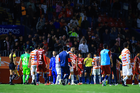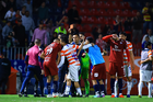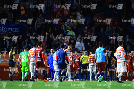 Tepatitlán, Jalisco, 06 de febrero del 2026. Jugadores de Correcaminos y Jugadores de Tepatitlán FC en conato de bronca, durante el partido correspondiente a la jornada 5 del torneo Clausura 2026 de la Liga BBVA Expansión MX, entre los Alteños de Tepatitlán FC y los Correcaminos de la UAT, realizado en el estadio "Tepa" Gómez. Foto: Imago7/Richard Vogel