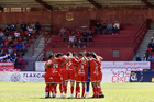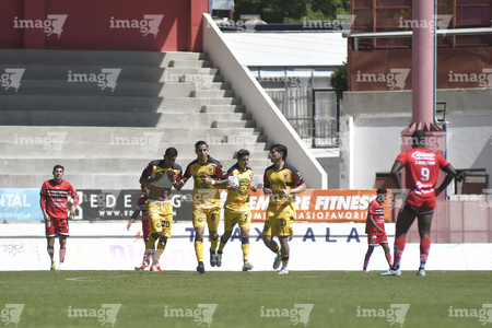 Tlaxcala, Tlaxcala, 8 de febrero de 2026. Jugadores de Coyotes en festejo de gol, durante el partido correspondiente a la jornada 5 del torneo Clausura 2026 de la Liga BBVA Expansión MX, entre los Coyotes de Tlaxcala y los Leones Negros de la UDG, realizado en el estadio Tlahuicole. Foto: Imago7/ Liz Romero