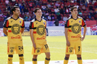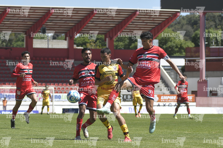 Tlaxcala, Tlaxcala, 8 de febrero de 2026. Juan Aguayo, Joel Pérez y Edson Rivera, durante el partido correspondiente a la jornada 5 del torneo Clausura 2026 de la Liga BBVA Expansión MX, entre los Coyotes de Tlaxcala y los Leones Negros de la UDG, realizado en el estadio Tlahuicole. Foto: Imago7/ Liz Romero