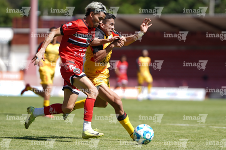 Tlaxcala, Tlaxcala, 8 de febrero de 2026. Daniel Torres y Ernesto Castillo, durante el partido correspondiente a la jornada 5 del torneo Clausura 2026 de la Liga BBVA Expansión MX, entre los Coyotes de Tlaxcala y los Leones Negros de la UDG, realizado en el estadio Tlahuicole. Foto: Imago7/ Liz Romero