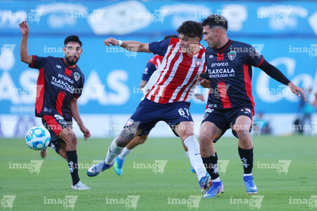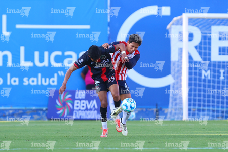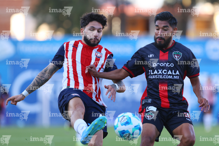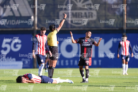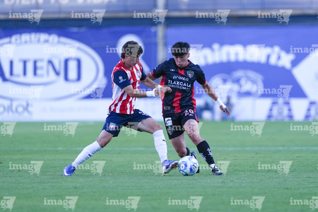 Tepatitlán, Jalisco, 7 de abril del 2026. Juan Blanco y Saúl Zamora, durante el partido correspondiente a la jornada 7 del torneo Clausura 2026 de la Liga BBVA Expansión MX, entre el CD Tapatío y los Coyotes de Tlaxcala, realizado en el estadio “Tepa” Gómez. Foto: Imago7/ Juan Carlos Cubeyro.