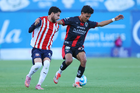 Tepatitlán, Jalisco, 7 de abril del 2026. Leonardo Jiménez y Erick Robles, durante el partido correspondiente a la jornada 7 del torneo Clausura 2026 de la Liga BBVA Expansión MX, entre el CD Tapatío y los Coyotes de Tlaxcala, realizado en el estadio “Tepa” Gómez. Foto: Imago7/ Juan Carlos Cubeyro.
