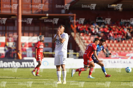 Tlaxcala, Tlaxcala, 28 de febrero de 2026. Omar Islas en lamento, durante el partido correspondiente a la jornada 8 del torneo Clausura 2026 de la Liga BBVA Expansión MX, entre los Coyotes de Tlaxcala y los Alteños de Tepatitlán, realizado en el estadio Tlahuicole. Foto: Imago7/ Liz Romero
