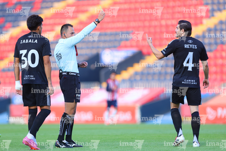 Tepatitlán, Jalisco, 6 de marzo del 2026. Diego Gurrea, árbitro central muestra tarjeta amarilla de amonestación a Rodrigo Reyes, durante el partido correspondiente a la jornada 9 del torneo Clausura 2026 de la Liga BBVA Expansión MX, entre el CD Tapatío y las Iguanas del Cancún FC, realizado en el estadio “Tepa” Gómez. Foto: Imago7/ Juan Carlos Cubeyro.