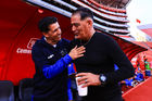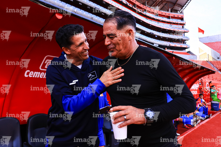 Tijuana, Baja California, 28 de marzo de 2026. Gustavo Díaz, director técnico y Francisco Ramírez, director técnico, durante el partido correspondiente a la jornada 12 del torneo Clausura 2026 de la Liga BBVA Expansión MX, entre los Dorados de Sinaloa y los Correcaminos de la UAT, realizado en el estadio Caliente. Foto: Imago7/Richard Vogel
