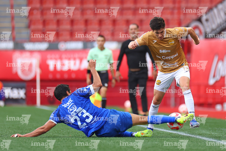 Tijuana, Baja California, 28 de marzo de 2026. Daniel Delgadillo y Luis Ruiz, durante el partido correspondiente a la jornada 12 del torneo Clausura 2026 de la Liga BBVA Expansión MX, entre los Dorados de Sinaloa y los Correcaminos de la UAT, realizado en el estadio Caliente. Foto: Imago7/Richard Vogel