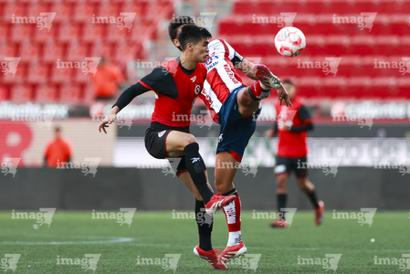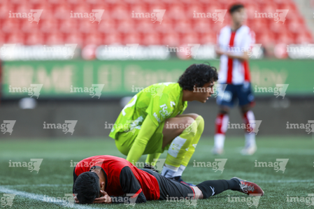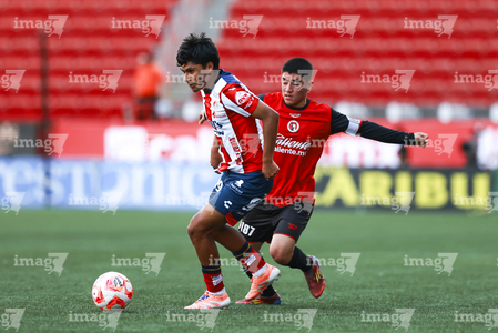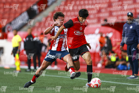 Tijuana, Baja California, 17 de enero de 2026. Eduardo Ochoa y Yoshimar Molina, durante el partido correspondiente a la jornada 3 del torneo Clausura 2026 de la Liga BBVA MX categoría Sub21, entre los Xolos de Tijuana y el Atlético de San Luis, realizado en el estadio Caliente. Foto: Imago7/Alejandro Gutiérrez Mora