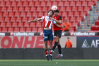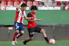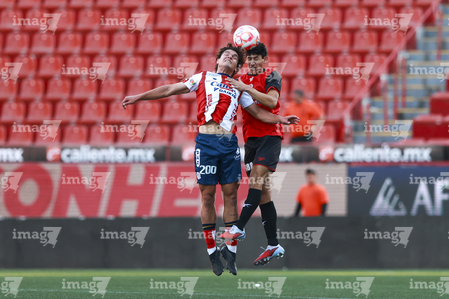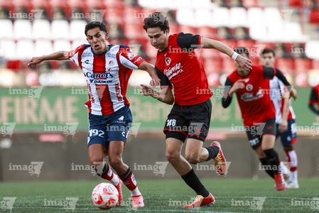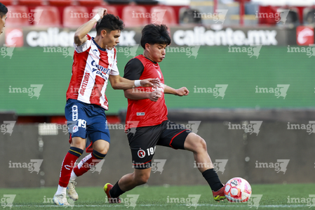 Tijuana, Baja California, 17 de enero de 2026. Joban González y Raúl Patrón, durante el partido correspondiente a la jornada 3 del torneo Clausura 2026 de la Liga BBVA MX categoría Sub21, entre los Xolos de Tijuana y el Atlético de San Luis, realizado en el estadio Caliente. Foto: Imago7/Alejandro Gutiérrez Mora