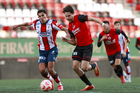 Tijuana, Baja California, 17 de enero de 2026. Marcelo Rangel y Alejandro Magallón, durante el partido correspondiente a la jornada 3 del torneo Clausura 2026 de la Liga BBVA MX categoría Sub21, entre los Xolos de Tijuana y el Atlético de San Luis, realizado en el estadio Caliente. Foto: Imago7/Alejandro Gutiérrez Mora